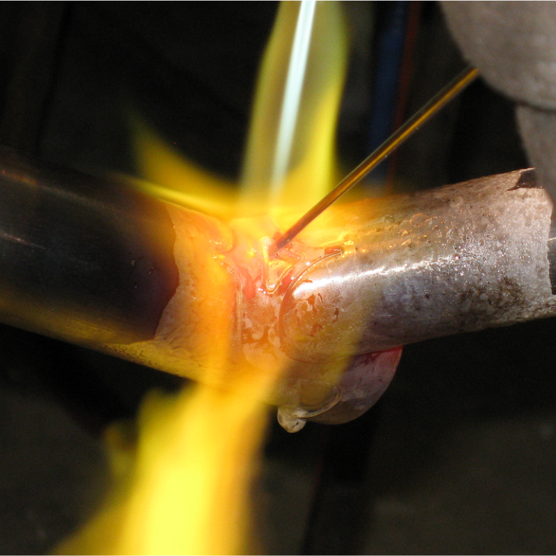 As soon as the pieces reach the brazing temperature, feed the rod in the joint area and let it melt and flow. Capillary action will draw the molten alloy inside of the joint. Avoid overheating, which might lead to damaged or deformed pieces, unsound joints, and emission of harmful fumes.